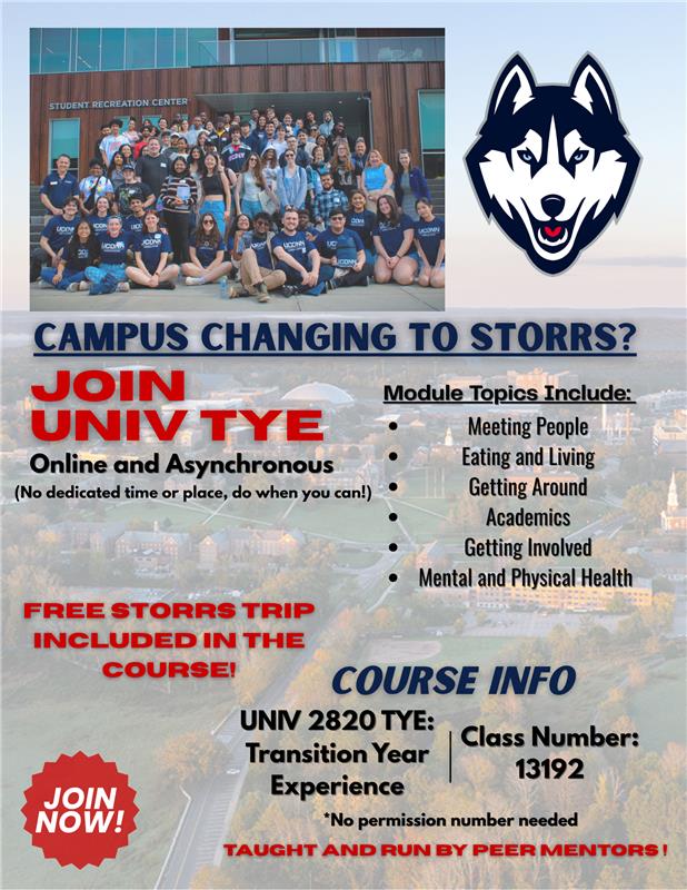 This course connects upcoming campus change students with FIRST peer mentors in an interactive asynchronous environment. Students learn details about life at UConn Storrs and tips for how to succeed academically, socially, and emotionally. Enrolled students also have the chance to visit Storrs to experience the classes and campus firsthand.
